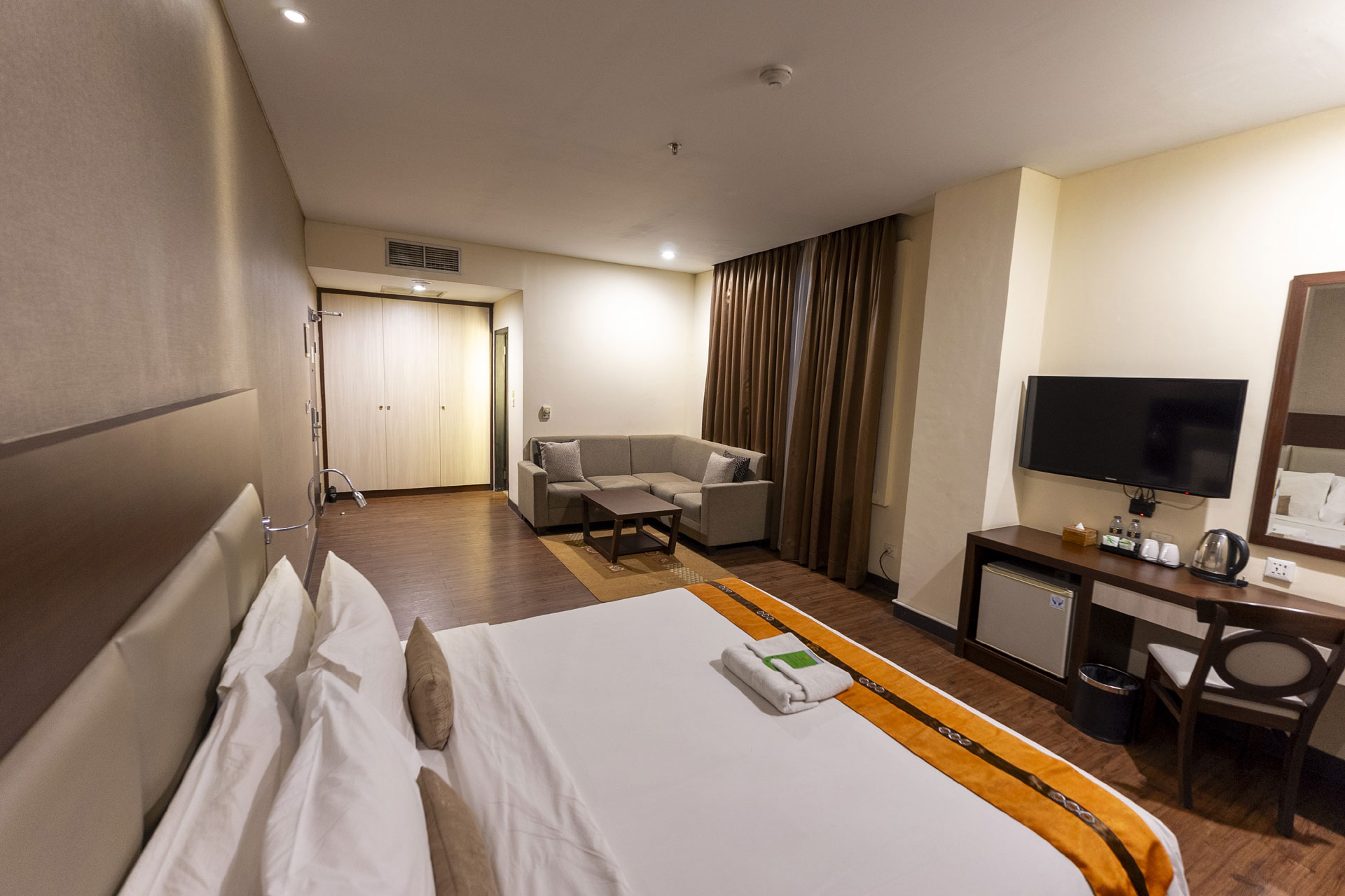 For Executives on the go, this is the perfect room. The living room area provided is also perfect for small meetings, or as your work station.